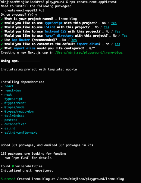 나는 가장 최신 버전으로 설치했다. 그리고 default로 지원해주는 TypeScript, ESLint, Tailwind CSS도 모두 설치 Yes.